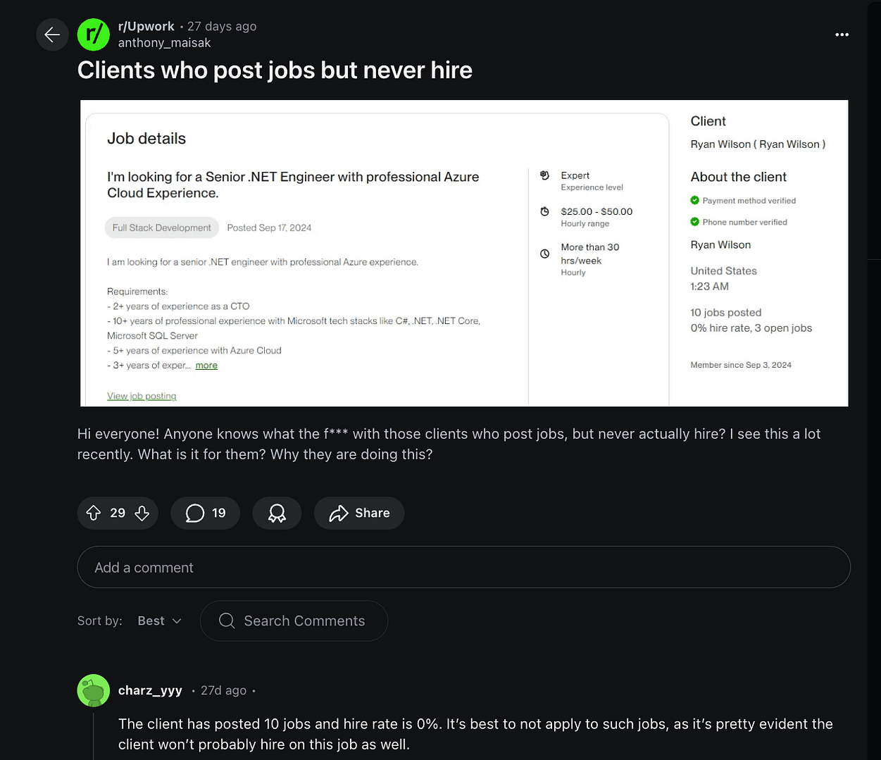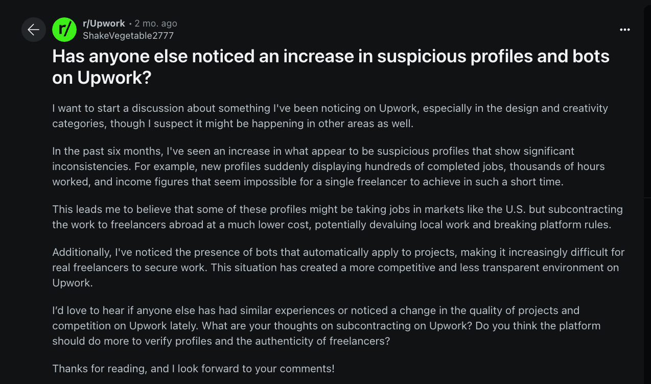 And this isn’t just speculation. Other Upwork users have raised similar concerns. Here’s one example: