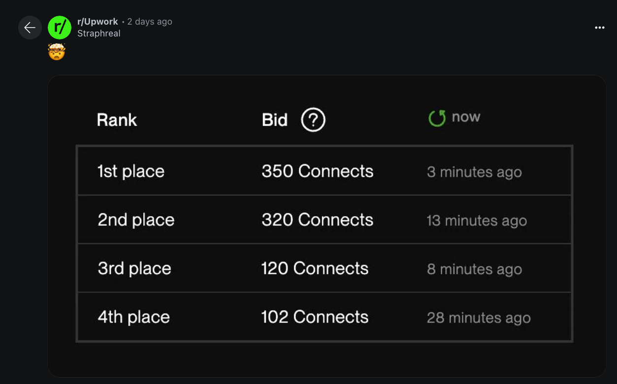 🙏 Before I go any further, though, I want to take a moment to acknowledge any freelancer who feels trapped by Upwork’s economy, pushed into this cycle just to stay visible. When I set out with my initial experiment, I didn’t fully understand the pressures the platform puts on freelancers and how it likely pushes people into strategies they might not otherwise choose. After learning more about Upwork’s structure, I feel a genuine empathy for everyone navigating this landscape, and I realize that simply spotlighting any questionable pitching methods doesn’t capture the whole story.