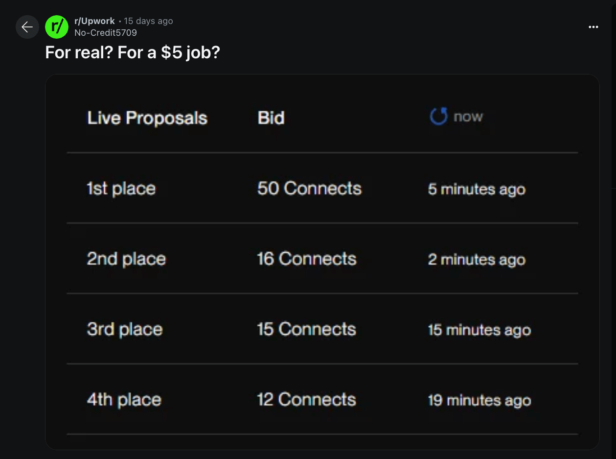 Calling Upwork’s Connects system “pay-to-play” doesn’t fully capture what’s going on – it’s really more like “pay-to-win.”