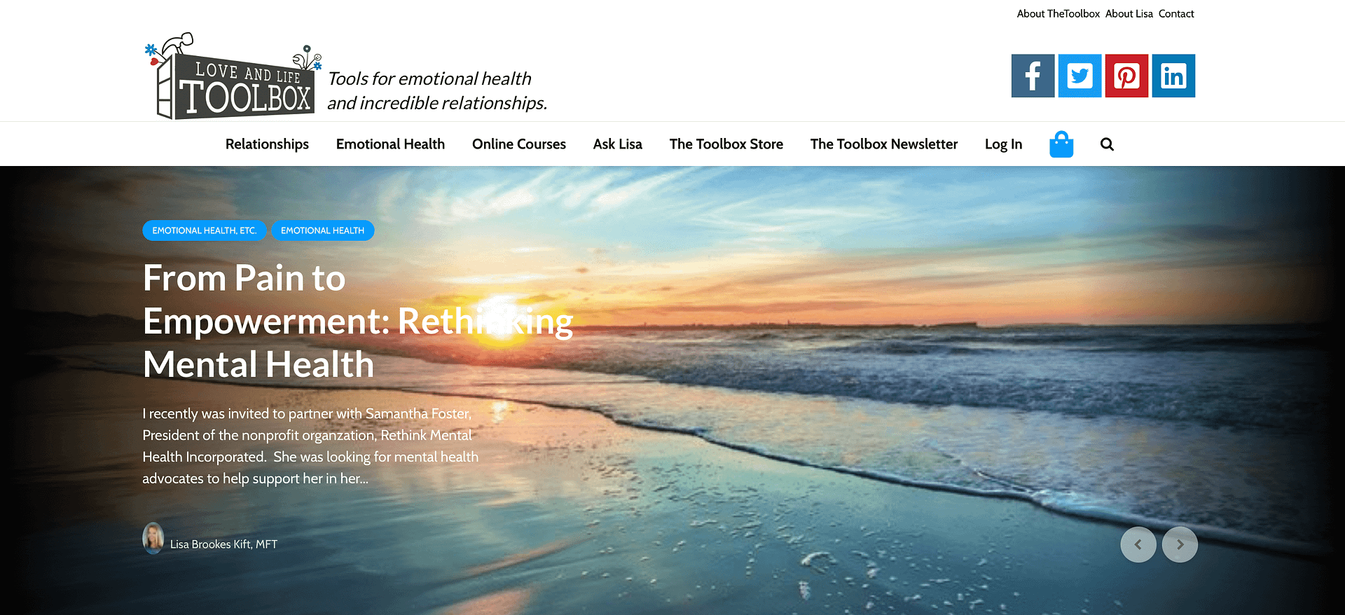 Lisa Brookes Kift, a therapist and founder of the Love and Life Toolbox, offers resources and various tools to help not only your relationships and marriages, but also your emotional health. While the content of the blog mainly comes from Lisa, she has other people who are also in the counseling or coaching professions write for the blog.